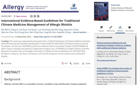 四川省整合医学科技发展研究会会长张勤修教授团队牵头制定的“International Evidence-Based Guidelines for Traditional Chinese Medicine Management of Allergic Rhinitis”于2025年9月在世界过敏与免疫学顶刊《Allergy》在线发表(DOI:10.1111/all.70057),标志着中医药防治变应性鼻炎的循证成果以国际指南形态进入全球学术交流主赛道。